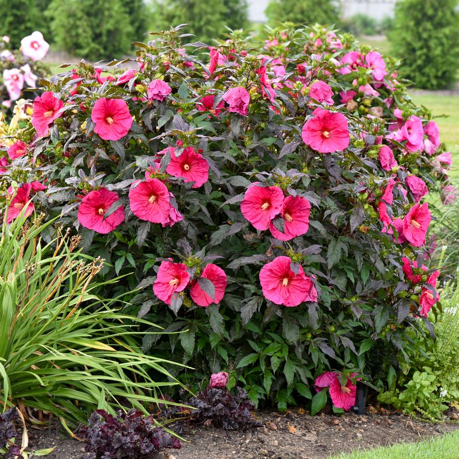 Puckered, hot pink blooms with near black foliage on this compact and well-rounded show stopper. Dramatic contract between flowers and foliage. Emerges late and then explodes into WOW!