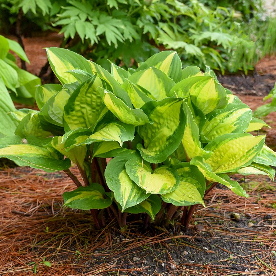 Wide, dark green margins with yellow centered thick leaves and red speckled petioles. Dark lavender flowers. Very strong growth rate.